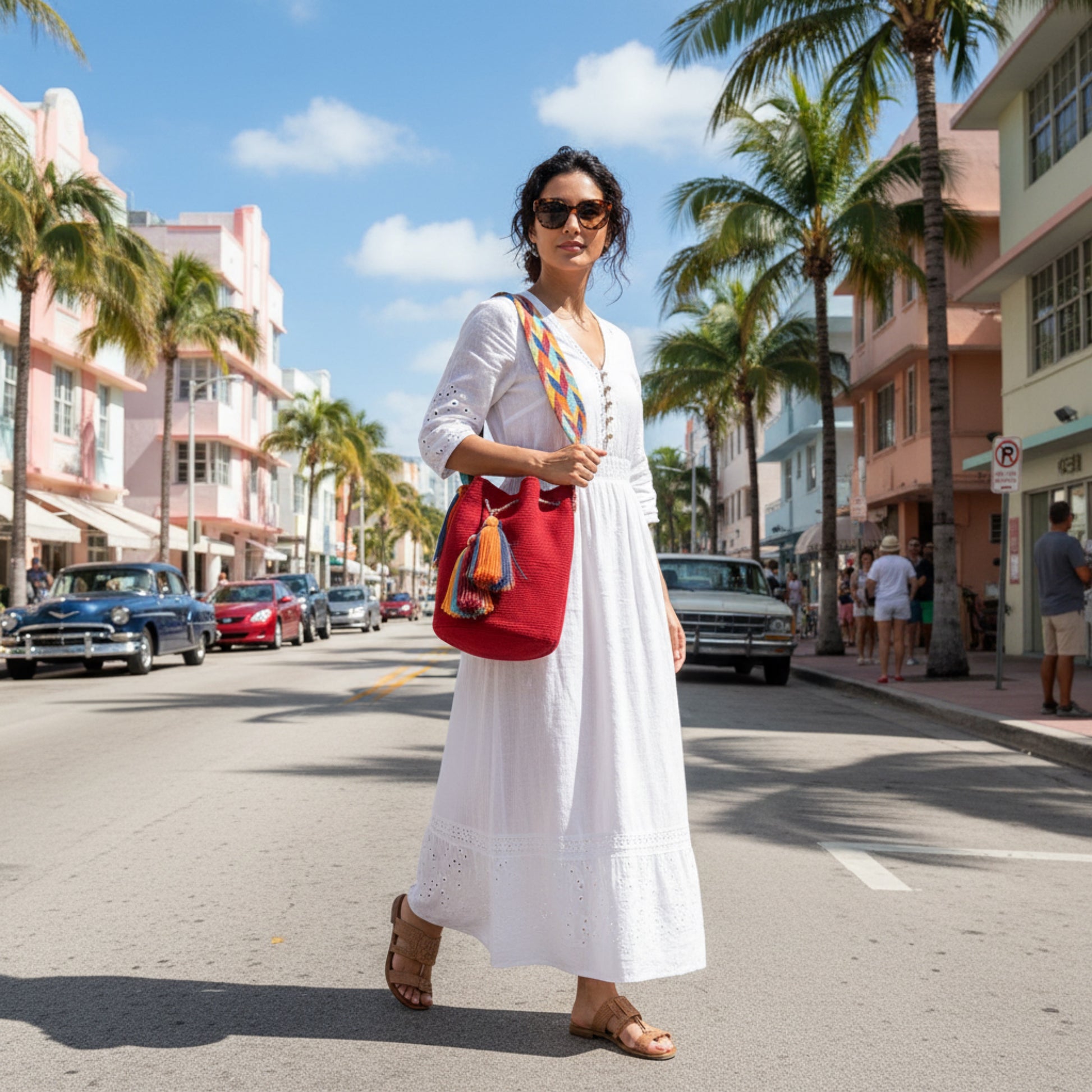 Brighten your style with this luxury large-sized Colombian mochila, vibrantly handwoven in deep red and accented with a bold, multicolored geometric strap and oversized tassels. This artisan-crafted bag merges traditional Colombian weaving techniques with fresh, energetic colors for a true statement piece.