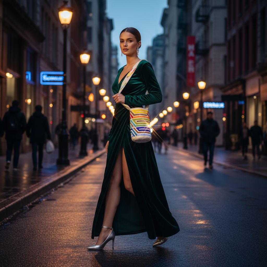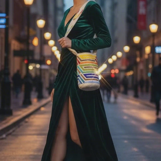 Show off your vibrant side with this luxury small Colombian mochila, a unique bag exquisitely handwoven by Colombian artisans. Every geometric rainbow motif is crafted from colorful beads, each one meticulously hand-sewn for an exquisite artisanal touch—truly a wearable work of art in compact form.