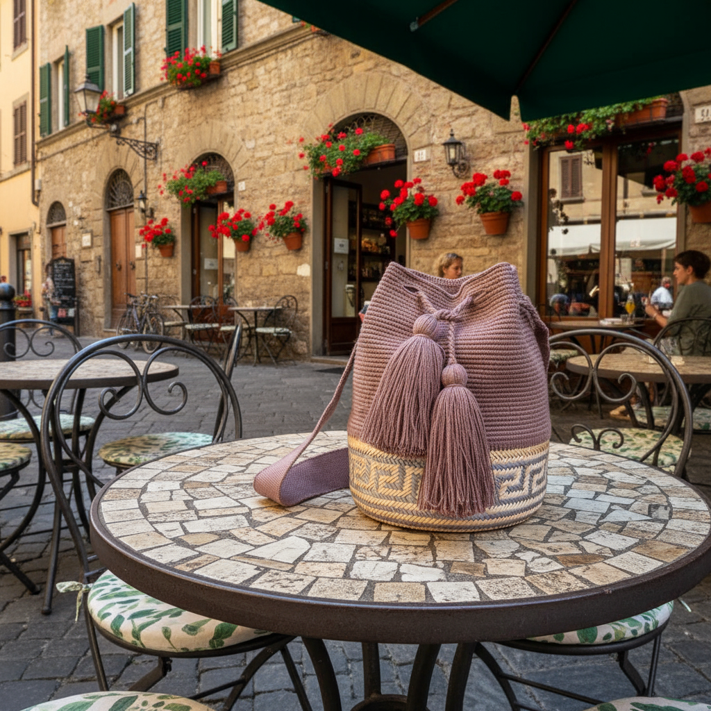 Add understated elegance to any look with this luxury small-sized Colombian mochila. Expertly handwoven in a soft mauve tone with a contrasted taupe and grey woven base, this bag is a beautiful expression of modern boho style fused with authentic Colombian tradition.