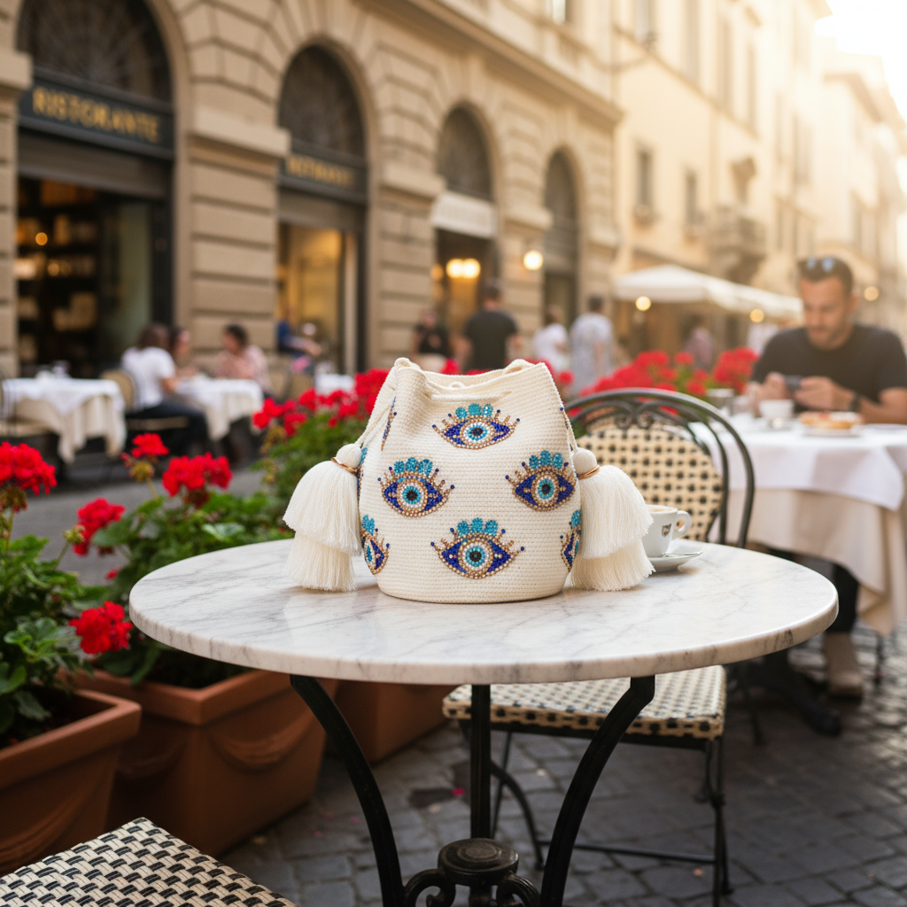 - Each evil eye is hand-beaded, making every bag one of a kind