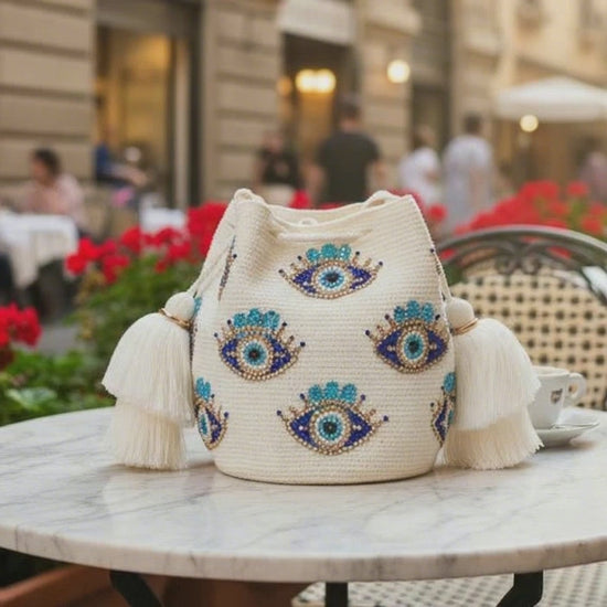 This stunning handmade Colombian mochila is a true work of art. Expertly woven by skilled artisans, it features hand-applied beaded evil eye designs in shimmering shades of blue, turquoise, and gold. Symbolizing protection and good energy, each eye is meticulously crafted to make this boho artisan purse both meaningful and luxurious.
