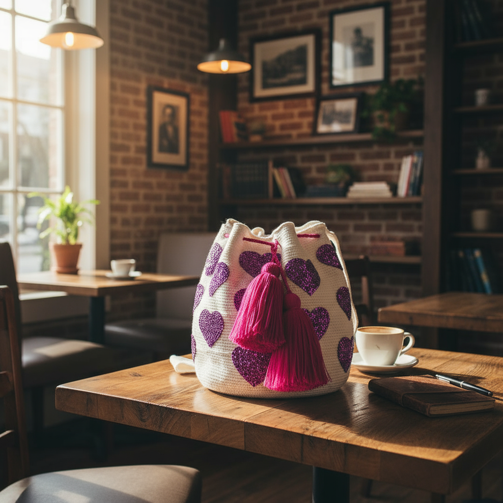 Elevate your accessory collection with this luxury medium-sized Colombian mochila, meticulously handmade in ivory and adorned with sparkling purple beaded hearts. This artisan-crafted bag combines a soft neutral base with vibrant accents, perfect for adding a pop of color and handcrafted elegance to any outfit.