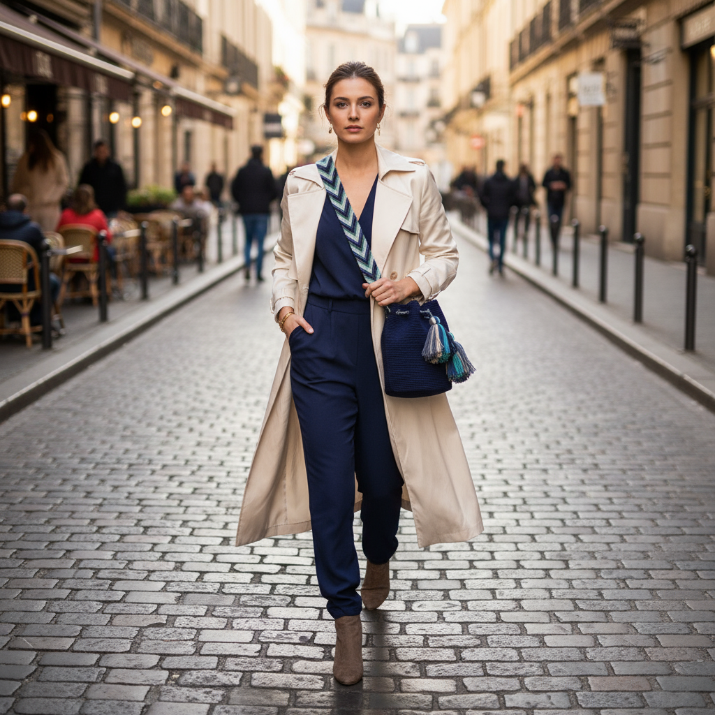 - Deep navy body with accent tassels in navy, aqua, beige, and teal