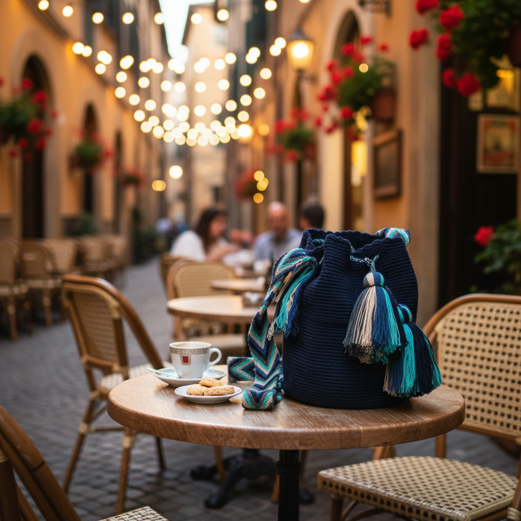 Embrace artisan elegance with this medium-sized Colombian mochila, handwoven in rich navy blue and accented by a vibrant chevron-patterned strap with aqua, beige, and teal details. Crafted by master artisans, this statement purse blends contemporary color with timeless Colombian tradition.