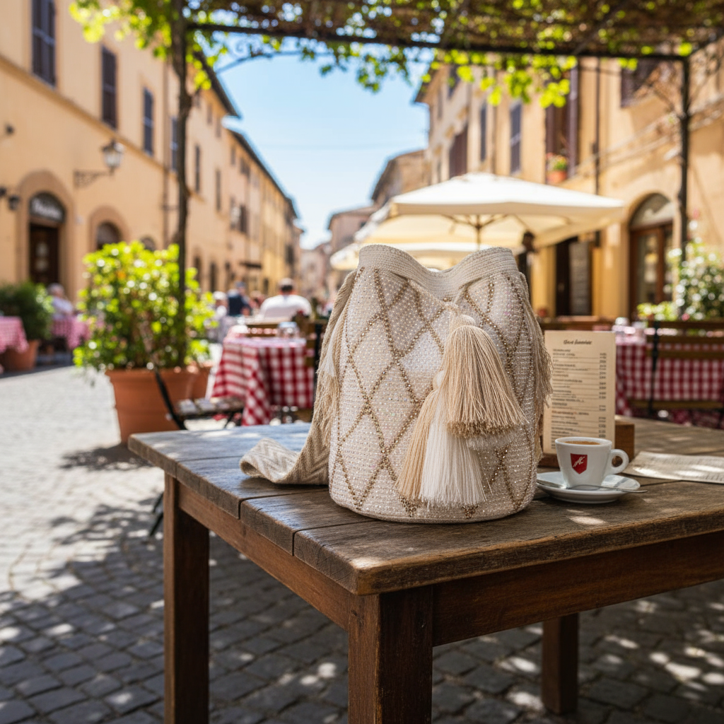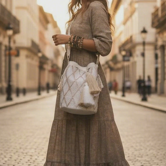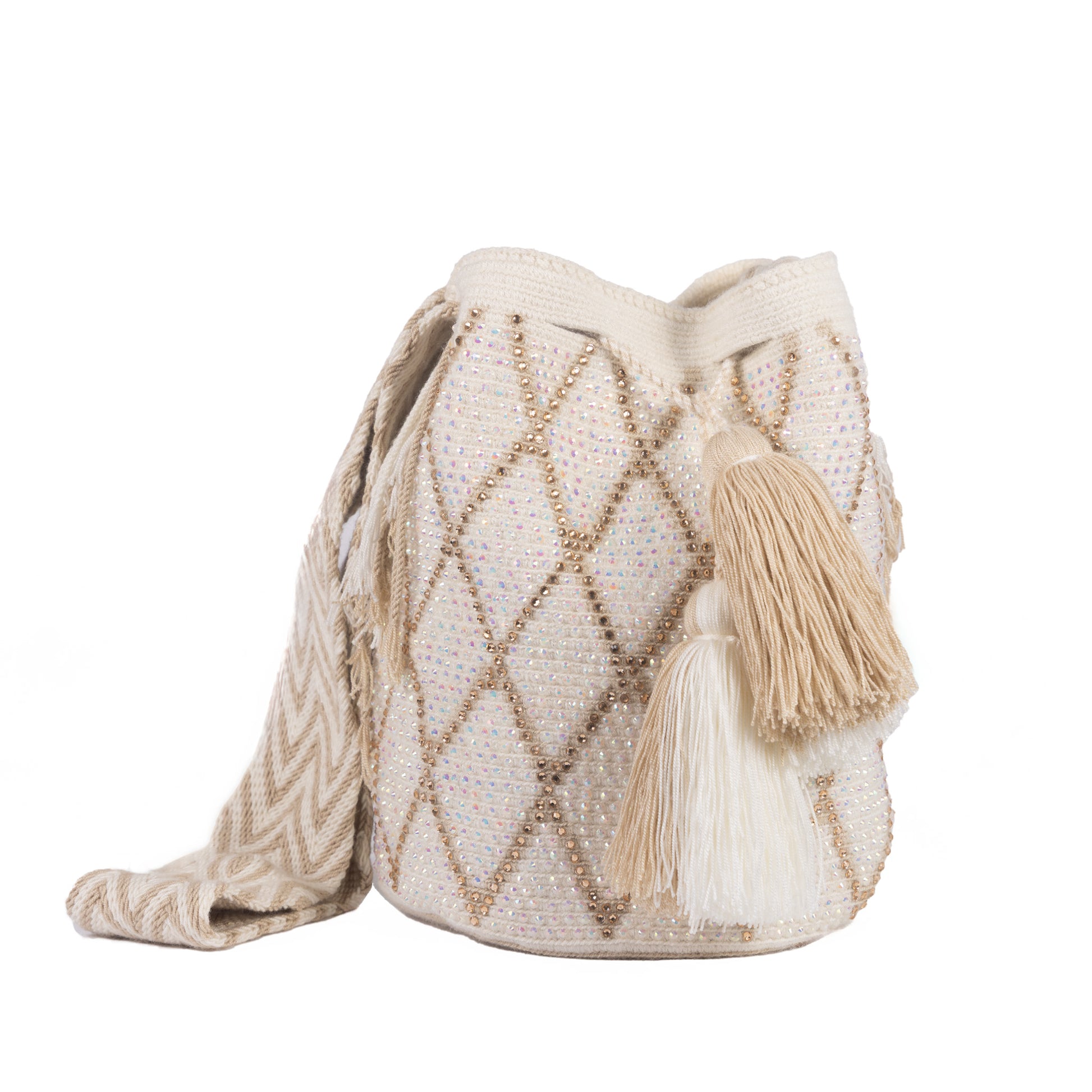 A perfect blend of Colombian tradition and modern elegance, this handmade mochila bag is crafted with care by skilled artisans. Each bag is woven from soft cotton threads and adorned with hand-applied beadwork that gives it a subtle, sophisticated sparkle.