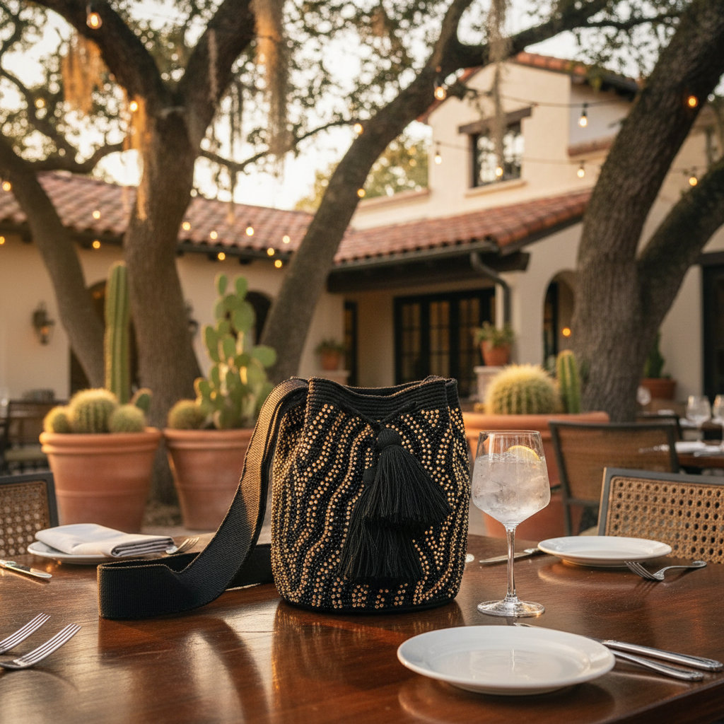 Stand out with this luxury medium Colombian mochila, beautifully handwoven in black and gold with intricate beaded geometric patterns. Meticulously crafted by skilled artisans, this bag offers a sophisticated blend of traditional Colombian artistry and bold modern style.